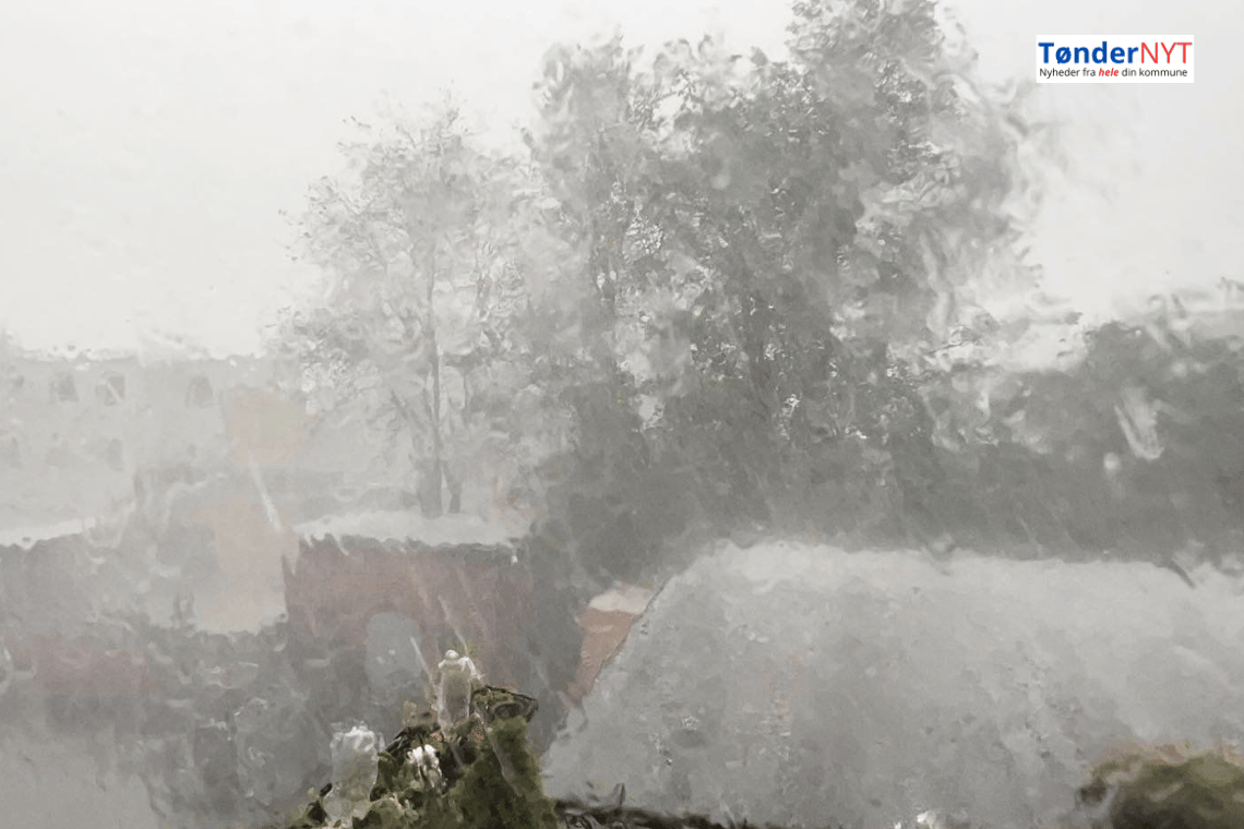 I det fjerne lå der mørke skyer og det varede ikke længe omkring kl 14.00, da det begyndte at regne meget voldsomt i nogle få minutter.