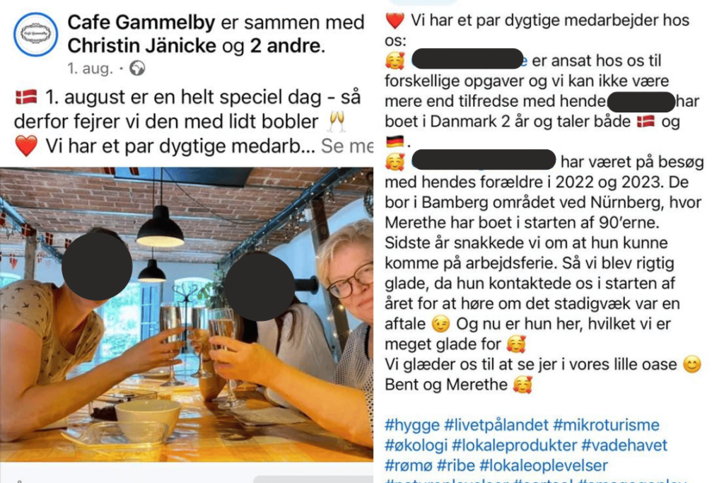 I facebookopslaget fra den 1. august anføres at en medarbejder både har været på arbejdsferie hos Cafe Gammelby i 2023 og været ansat siden starten af 2024, hvilket modsiger pressemeddelelsen, hvori der som anført skrives, at det er “her i løbet af 2024 har vores succes overhalet os fuldstændigt“.