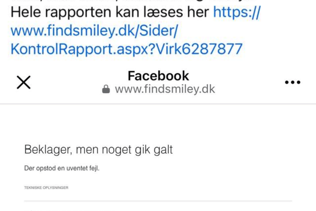 I den udsendte pressemeddelelse refereres til et link på fødevarestyrelsen. Men i opslaget henvises til et tomt link, som det også fremgår af nedenstående skærmkopi. For at kunne finde kontrolrapporten skal man ind på stedets webside eller på Findsmiley.dk for at finde den nævnte kontrolrapport.