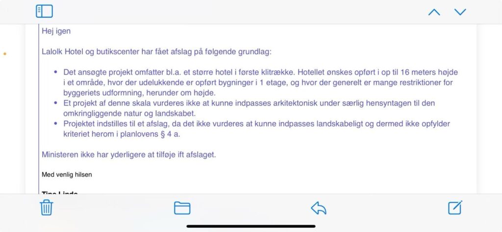 Direktør for Rømø & Tønder Turistforening Colin Seymour har tidligere i denne uge fortalt til TønderNYT, at man fra turistforeningen tager afslaget til efterretning, men at man håber at der kan komme flere hotelpladser et sted på Rømø grundet at der er mangel på sådanne overnatningspladser.