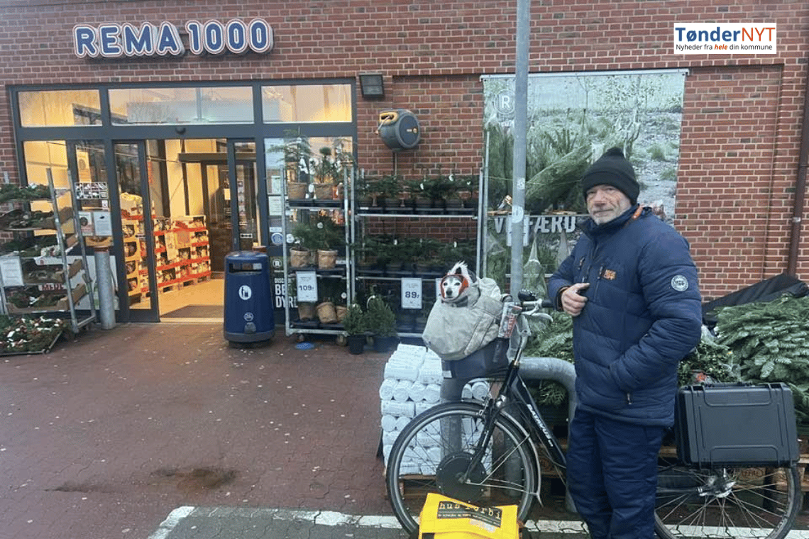 Henning og hunden Felix står ved Rema 1000 i Tønder i dag.