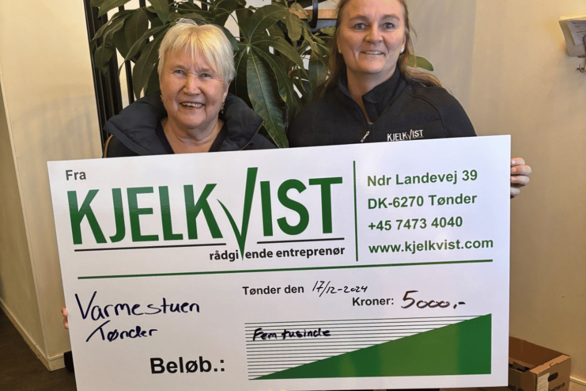Kjelkvist A/S har doneret en gavecheck på hele 5.000 kroner til Varmestuen i Tønder. Varmestuen er et vigtigt samlingspunkt for mennesker i byen, der har brug for et varmt måltid mad, en snak og et sted at være. Med denne donation vil varmestuen kunne fortsætte deres vigtige arbejde og sikre, at alle har mulighed for at få en god jul.