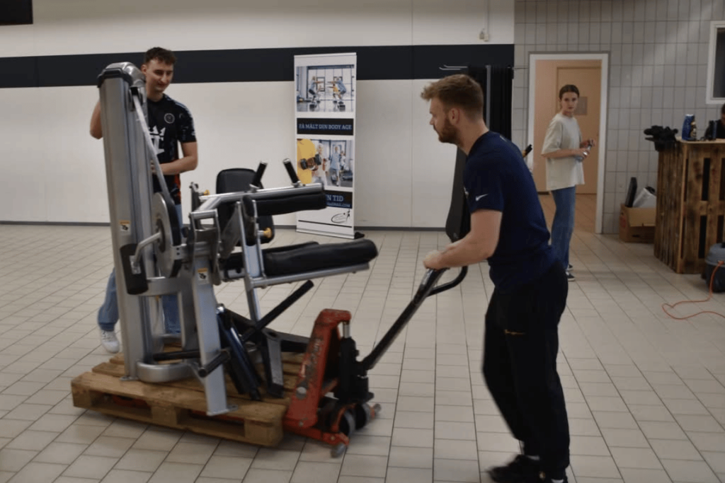 Flytningen af fitnesscentret var et stort projekt, der krævede mange hænder. Frivillige har i weekenden knoklet med at flytte tunge maskiner og sætte dem op i de nye lokaler. Det har været et imponerende syn at se gaffeltrucks køre frem og tilbage mellem de to bygninger.