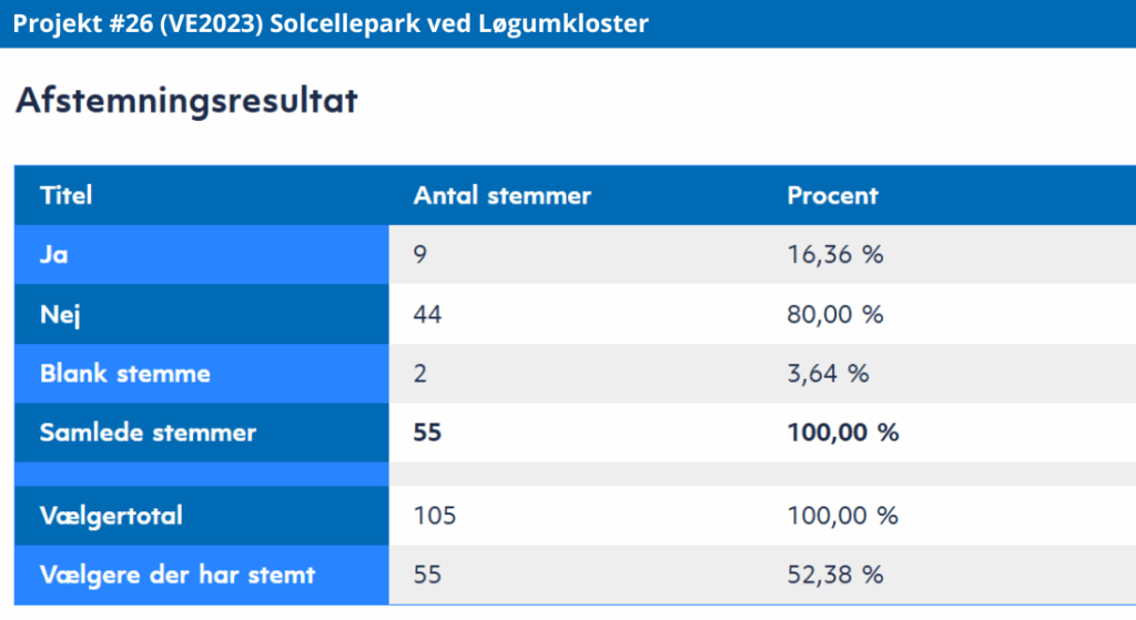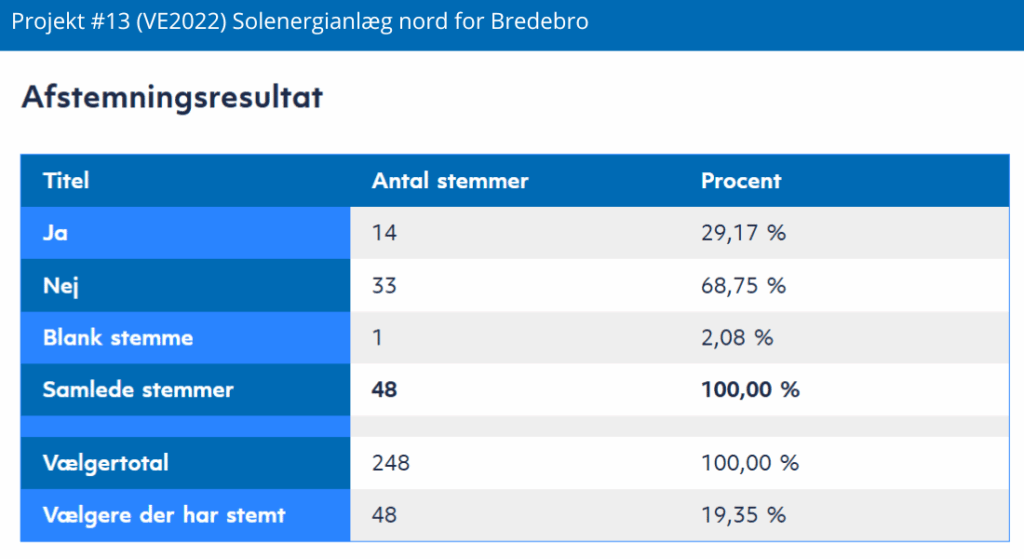 Resultatet viser et klart flertal på over 64 % af de afgivne stemmer imod solcelleparken. Ligesom ved de andre projekter med negativt resultat, er der en tydelig modstand mod etableringen af anlægget i nærområdet.