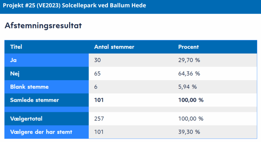 Solcelleparken ved Ballum Hede oplevede en deltagelsesprocent på 39,30 %, hvor 101 ud af 257 stemmeberettigede afgav deres stemme. Dette er en solid deltagelse, som indikerer, at projektet har vakt debat og mobiliseret borgere i området.