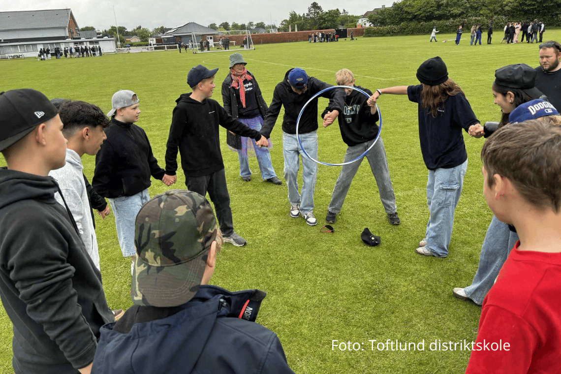 På artikelfotoet skulle kan ses en af de opgaver de 15 6. klasser der var tilmeldt dagen i Bredebro skulle igennem. De skulle samarbejde om at få en hulla hopring til at vandre fra den ene til den anden uden at tabe den samtidig med at de holdt hinanden i hånden.