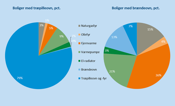 Anderledes ser det ud for boliger med træpilleovn eller -fyr. Her bruges ovnen eller fyret som primær varmekilde i hele 79 procent af tilfældene.