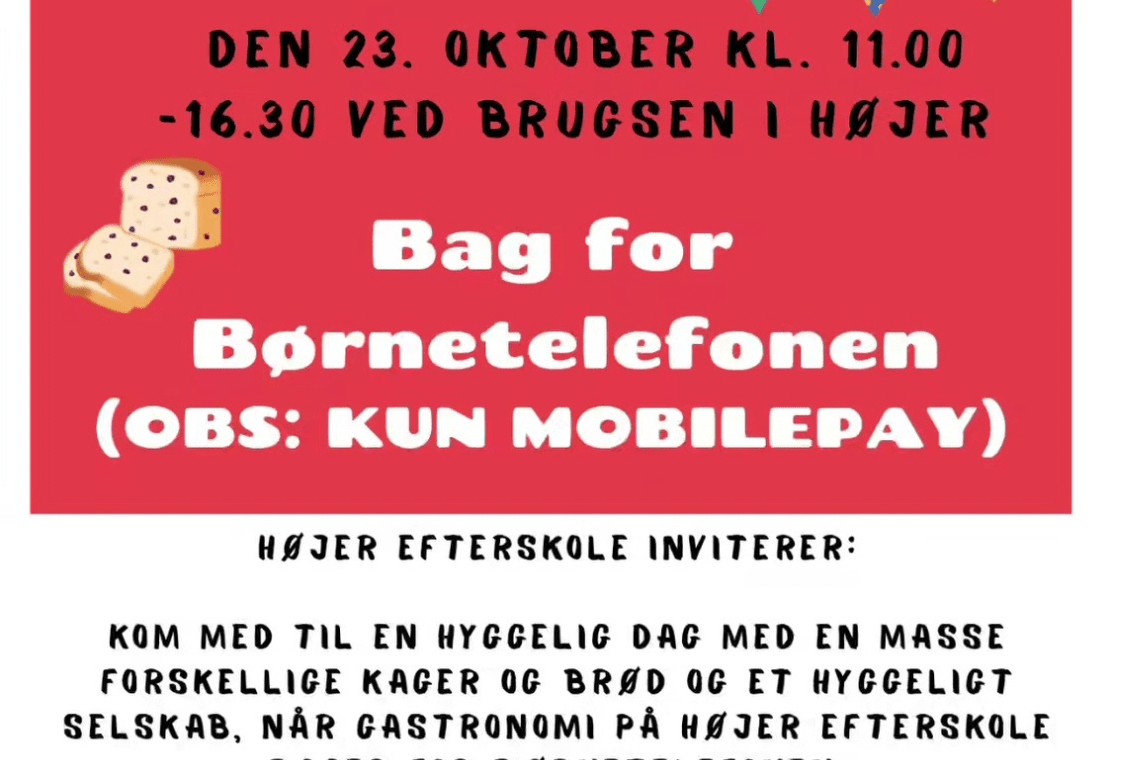 Torsdag den 23. oktober bliver der ekstra liv ved Brugsen i Højer. Her vil elever fra Højer Efterskole stå klar i et stort hvidt telt med friskbagte kager og brød – alt sammen til fordel for Børns Vilkår og BørneTelefonen.